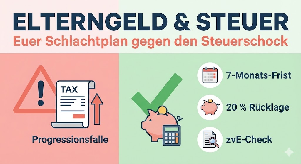 | Monatlich ab Elterngeld-Start | 20 % Rücklage bilden | Sicherheitspuffer gegen die Progressions-Nachzahlung. |
